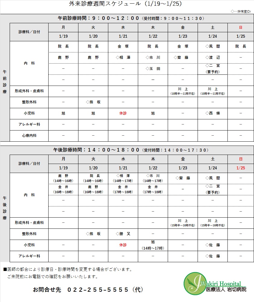 外来診療予定表(1/19~1/25)について