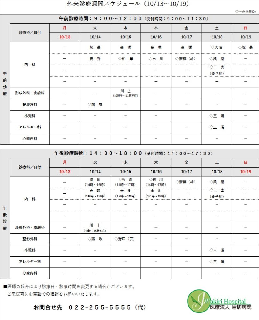 外来診療予定表(10/13~10/19)について