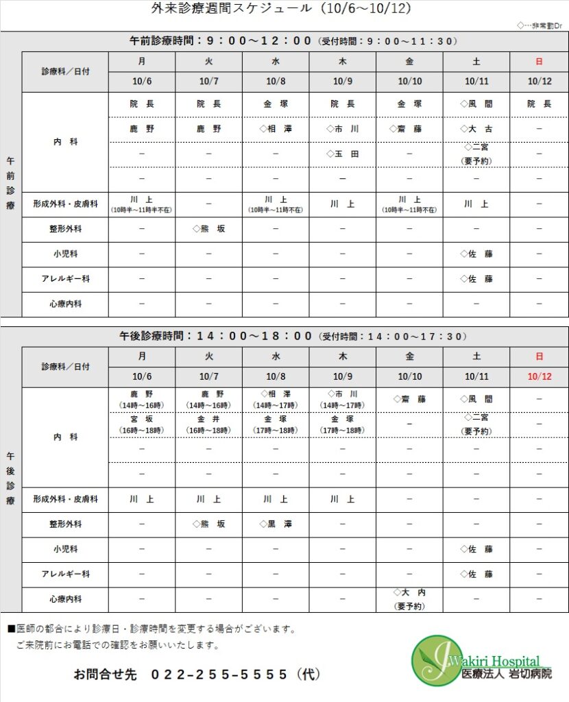 外来診療予定表(10/6~10/12)について