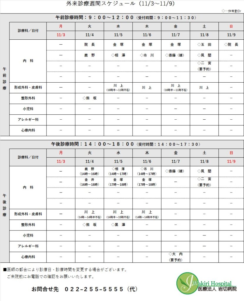 外来診療予定表(11/3~11/9)について
