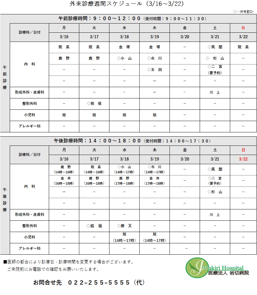 外来診療予定表(3/16~3/22)について