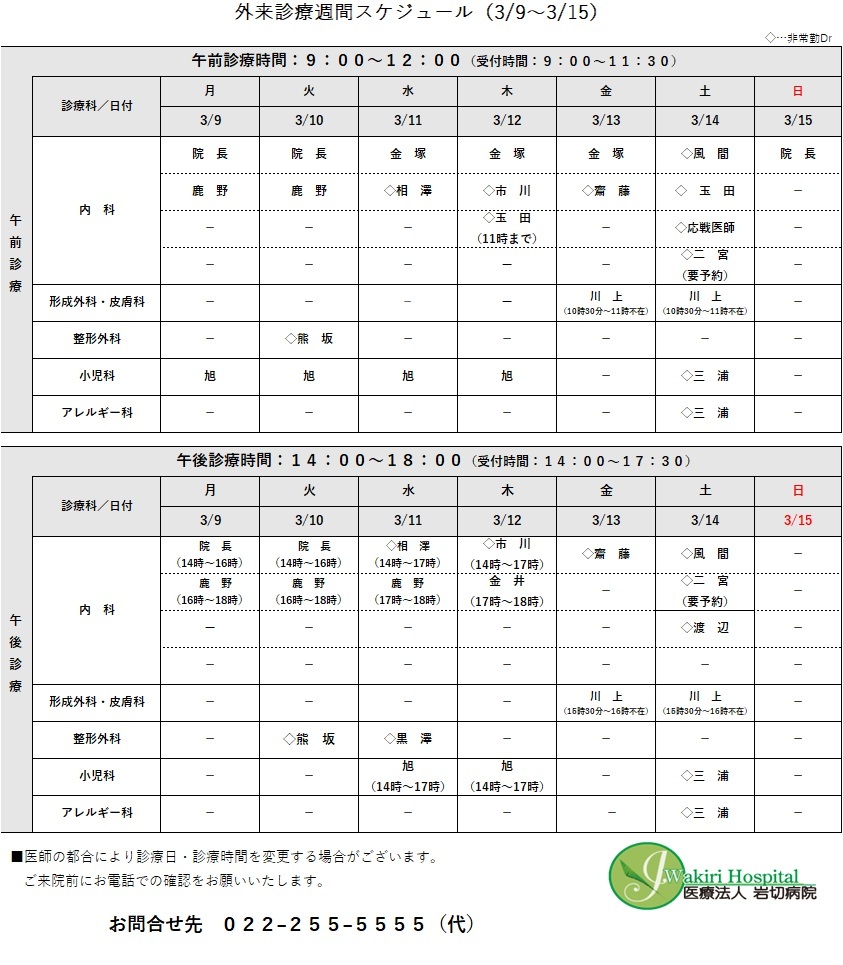 外来診療予定表(3/9~3/15)について