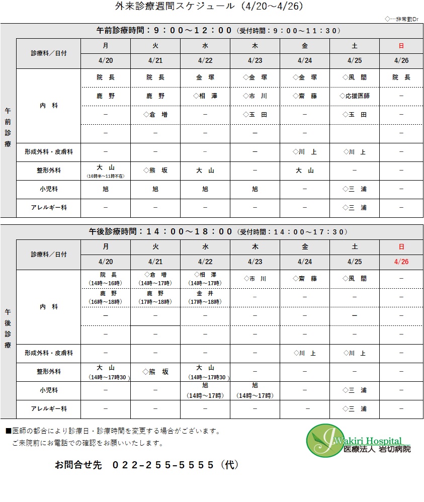 外来診療予定表(4/20~4/26)について